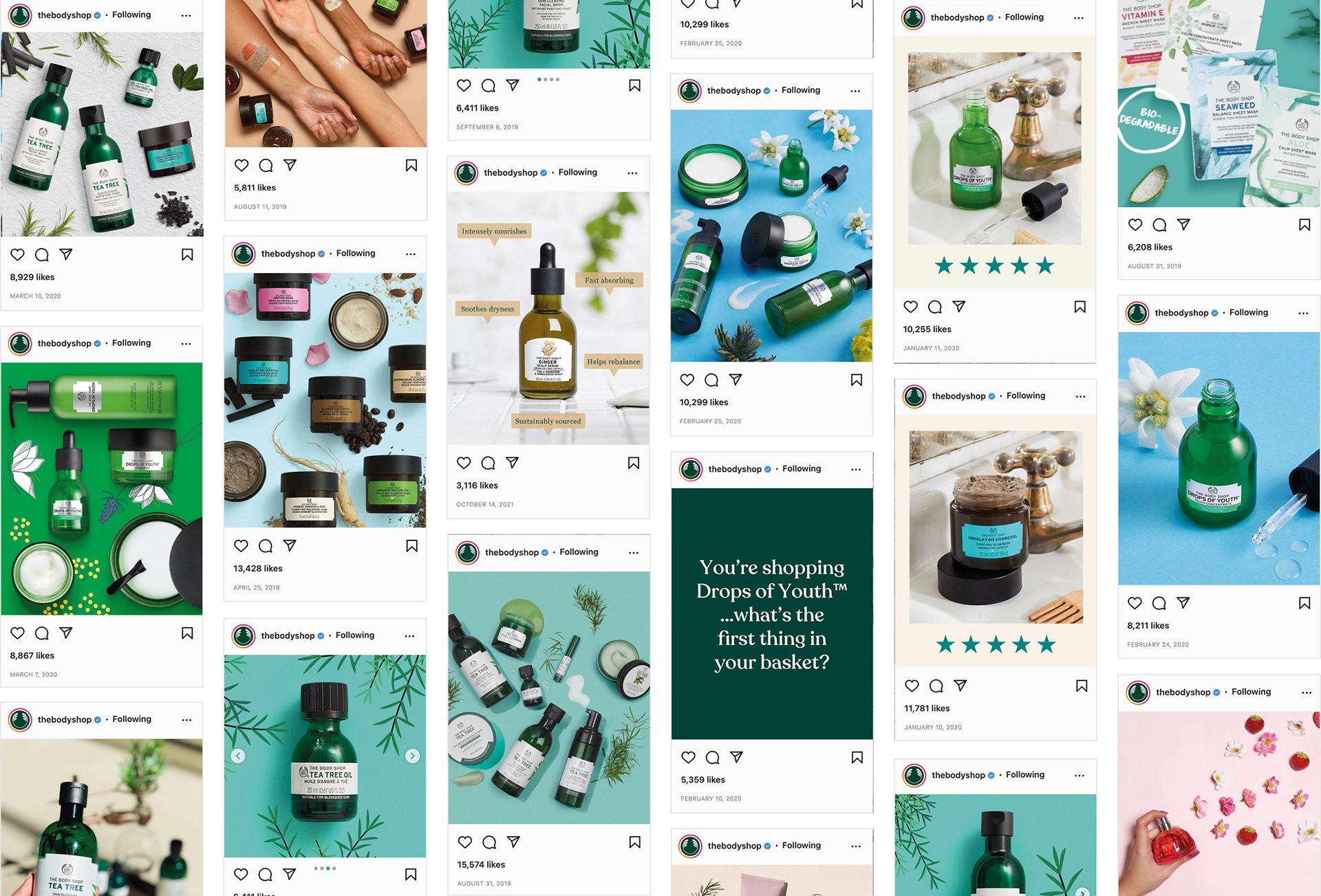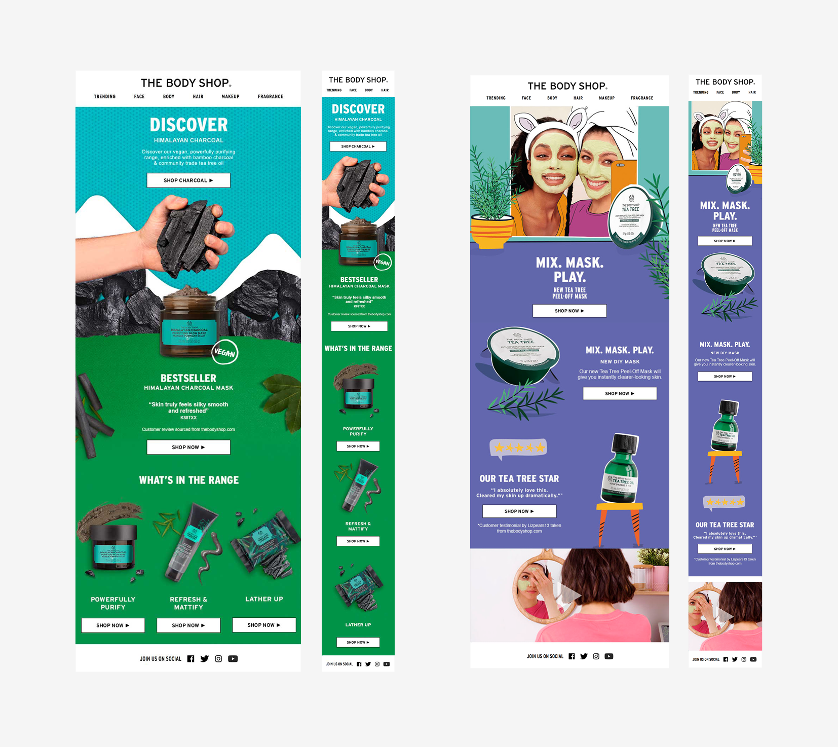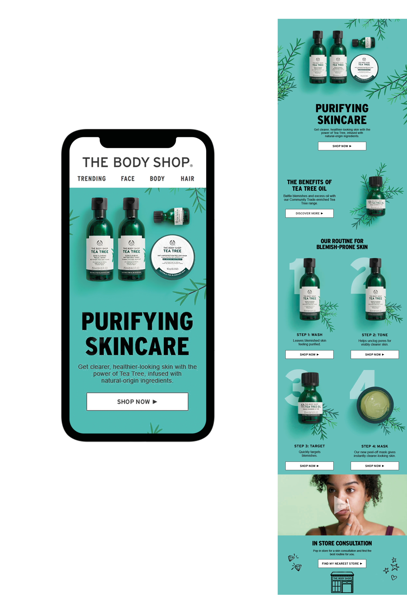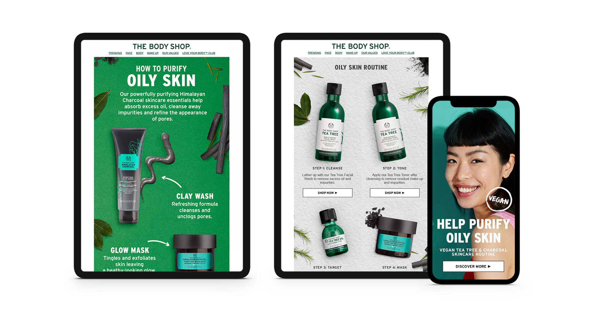 Skincare emails and social media promoting the Body Shop’s best selling ranges and new products.