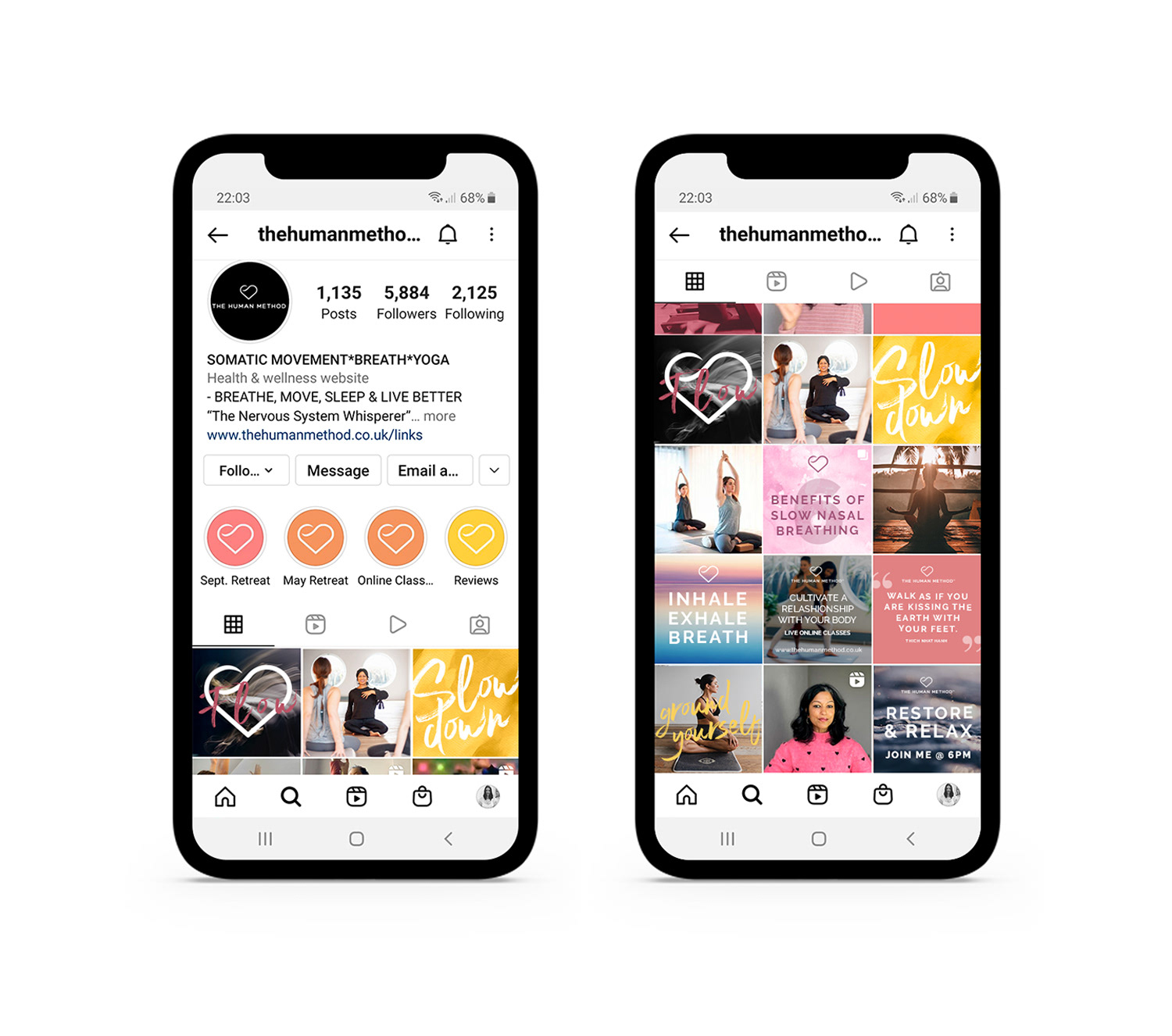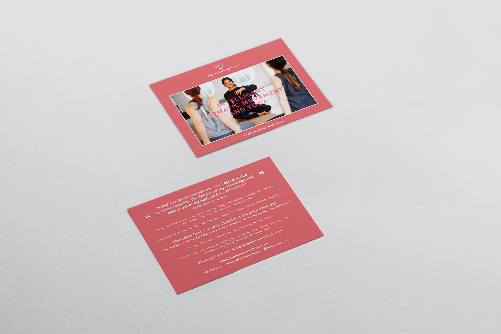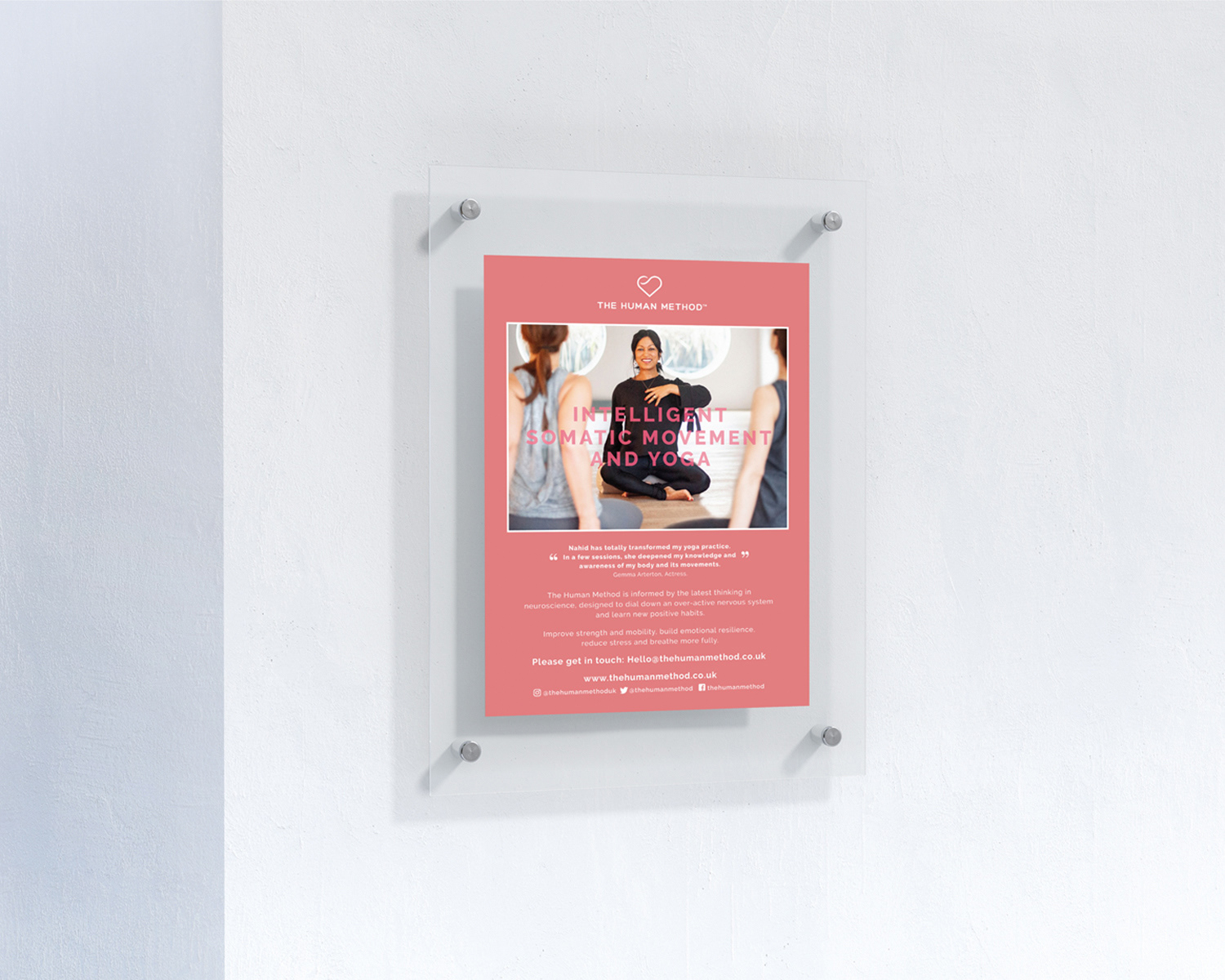 An identity project for The Human Method, somatic yoga classes. Logo design, social slidesĀ and template, including colour guide, posters and flyers.